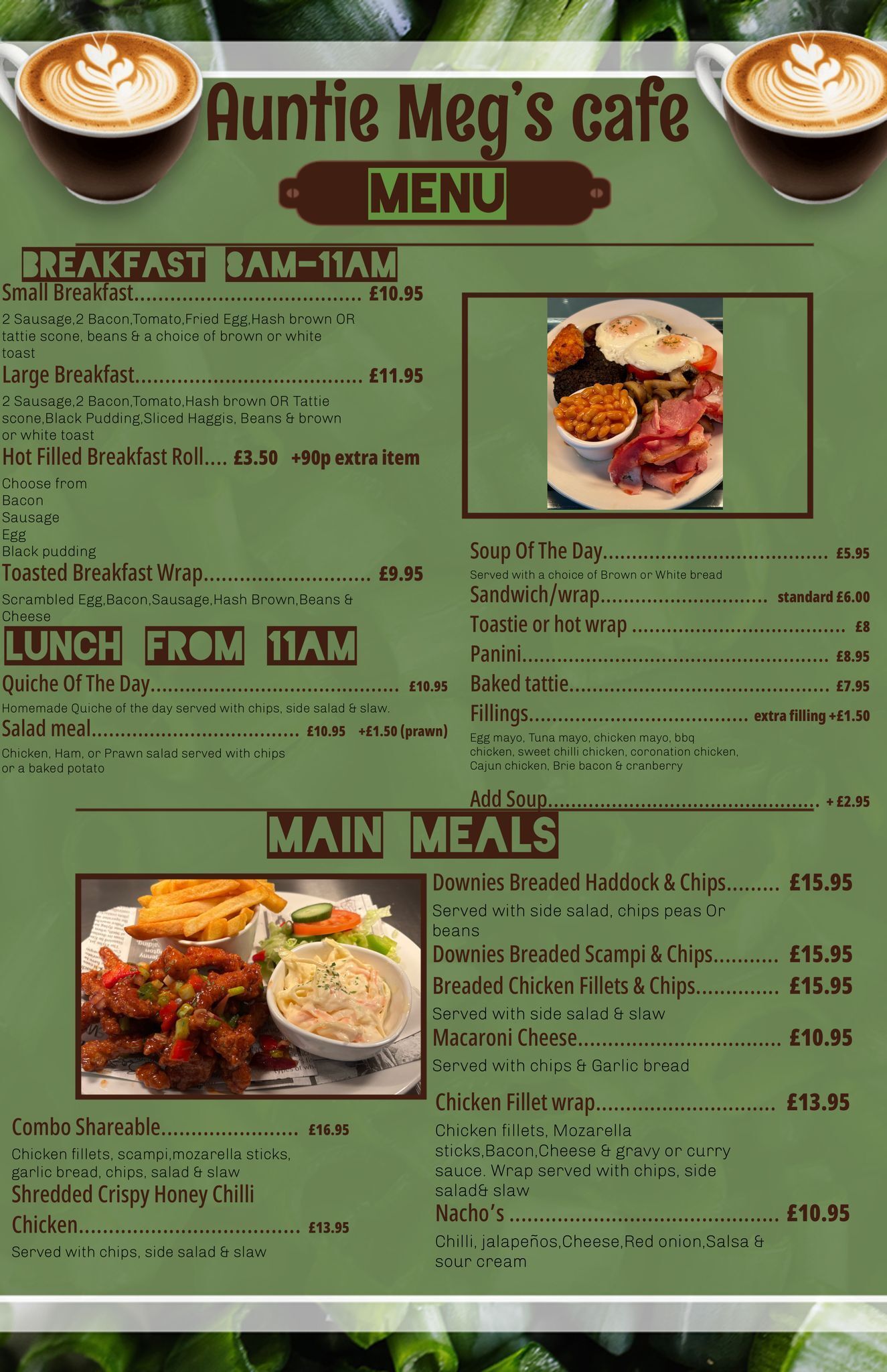 Breaded Haddock (supplied from Downies Whitehills) meal, which includes breaded haddock accompanied by chips, side salad and coleslaw.