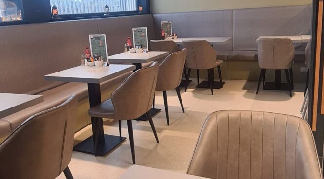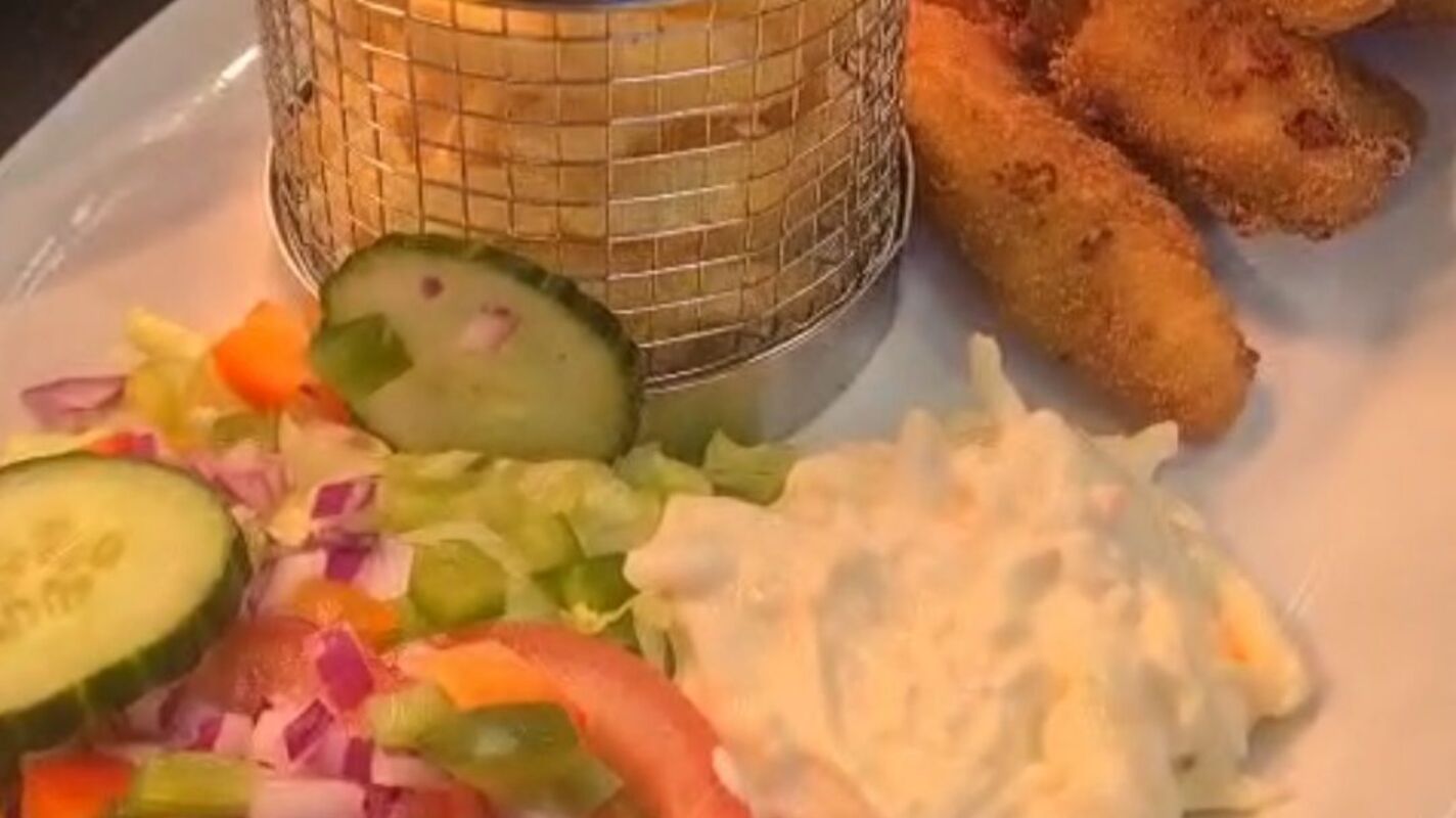 Chicken Fillet meal, which includes breaded chicken fillets accompanied by chips, side salad and coleslaw.