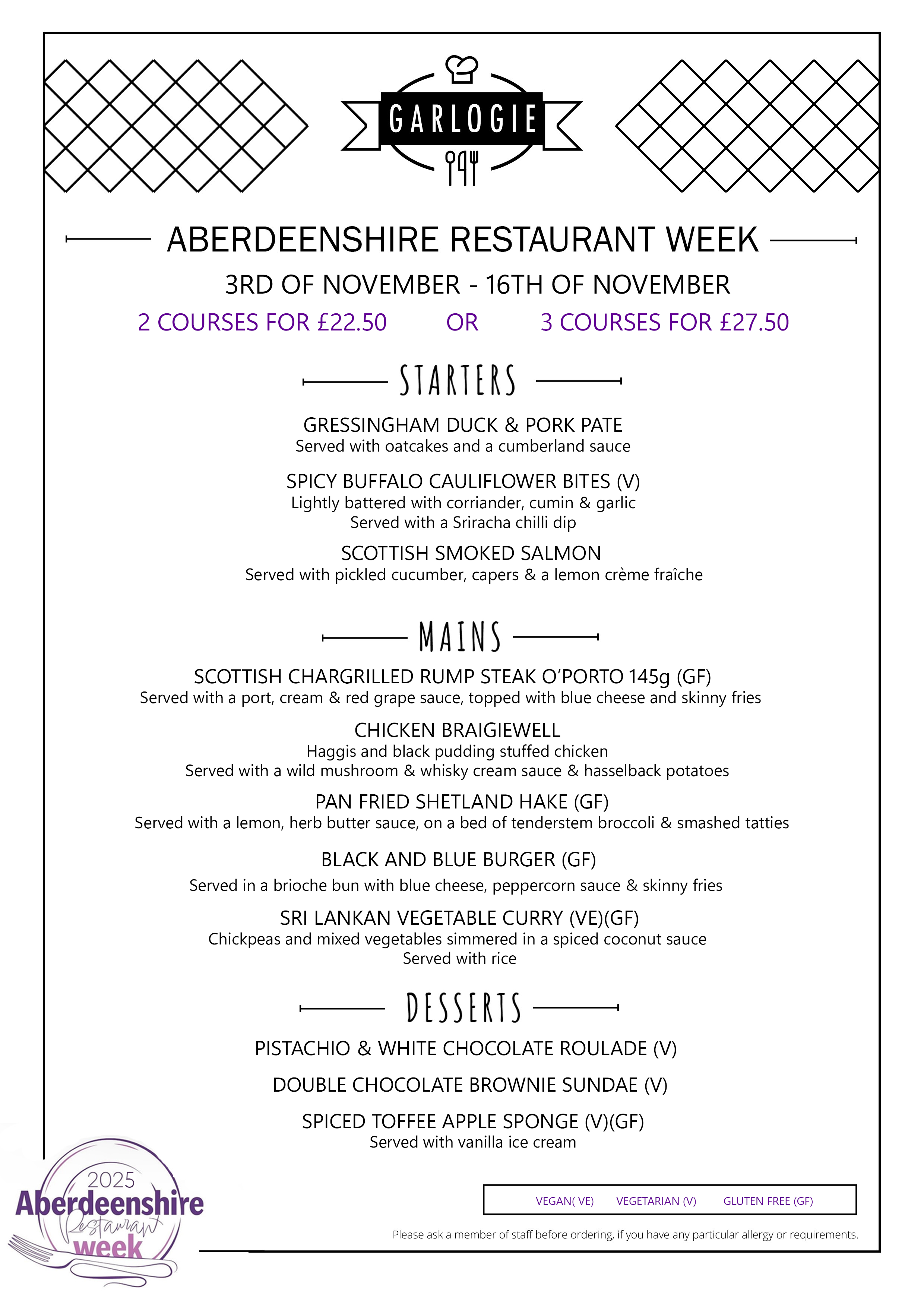 2 Courses £22.50 ; 3 Courses £27.50